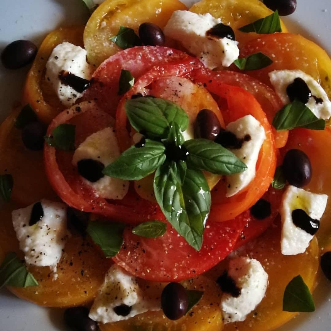 Rosace de tomates Rose de Berne avec fêta et huile d'olive.. Le tout biologique