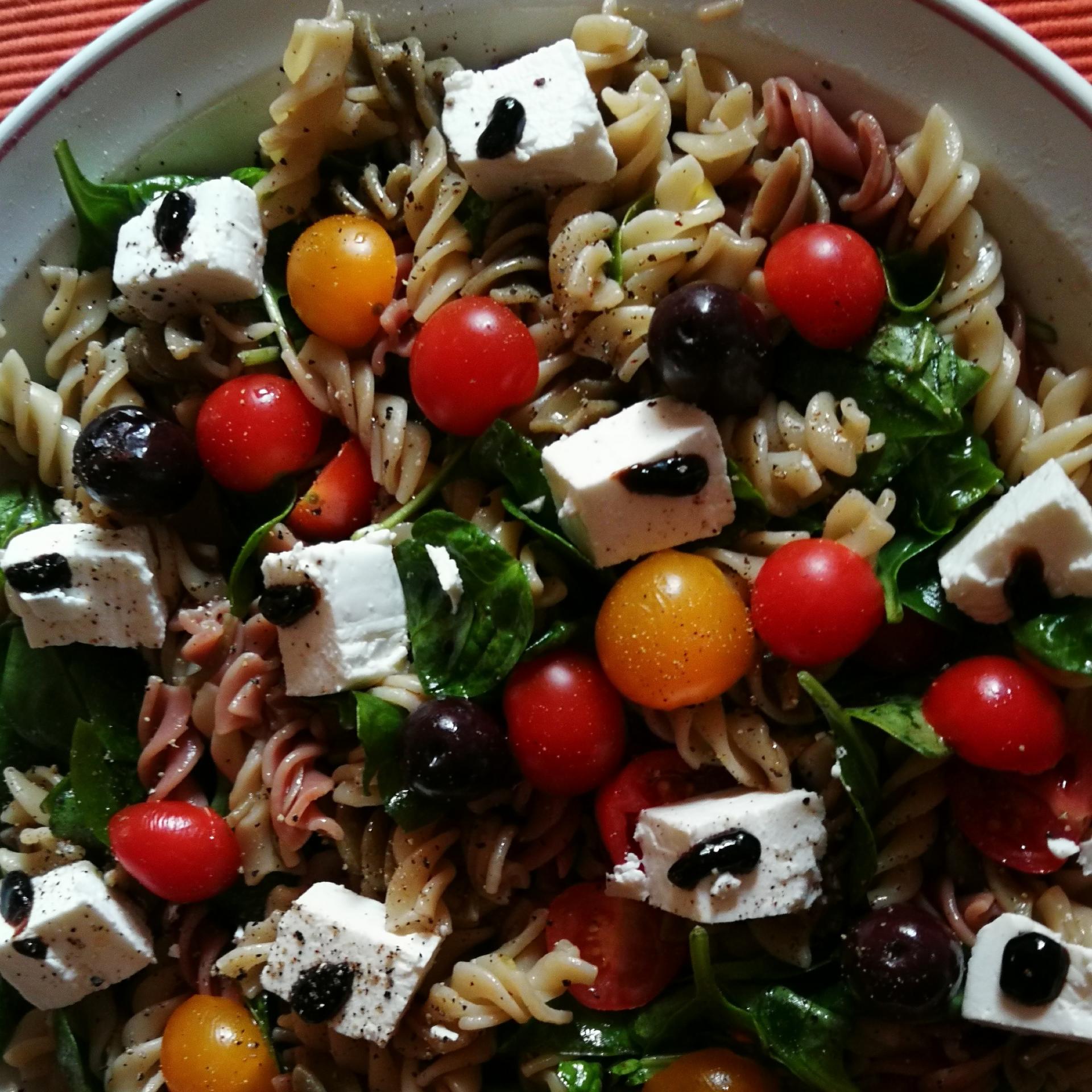 Salade de pâtes tricolores au quinoa avec fêta, tomates cerises, olives noires et huile d'olive.. Le tout biologique. (Ne convient pas aux intolérants au gluten)